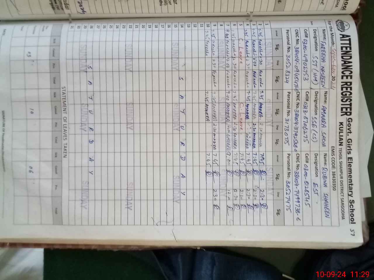 | CNIC | Full Name | Designation | R/C | Absence During Last Calender Month |