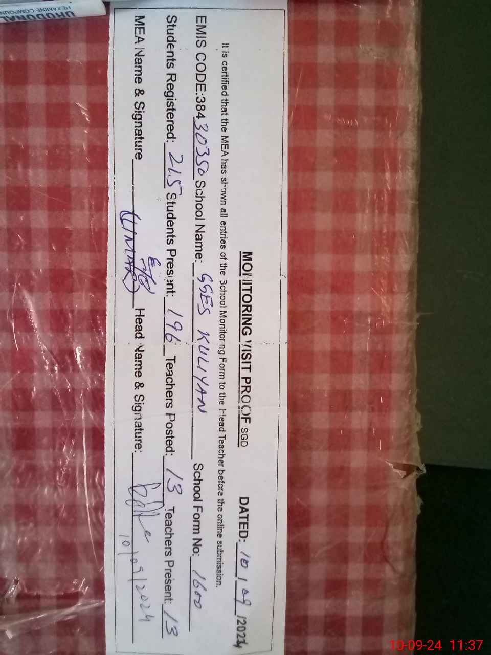 | Certified that this School was Inspected by the Undersigned MEA/DMO Today and the Information Stated Above is as Per Record. | |||||