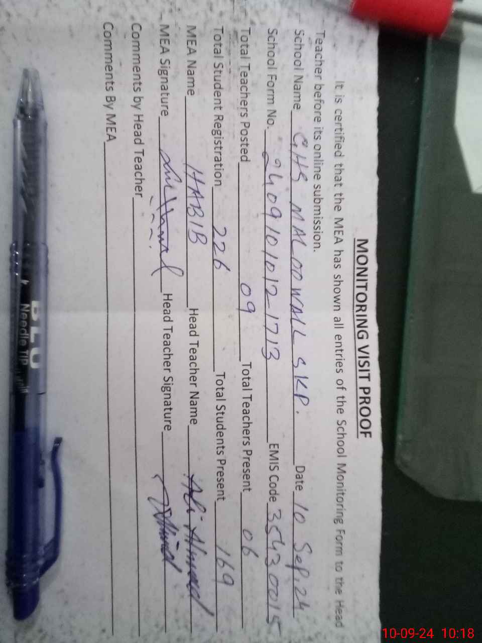 | Attendance Register | Head Teacher | MEA with School | Visit Proof |