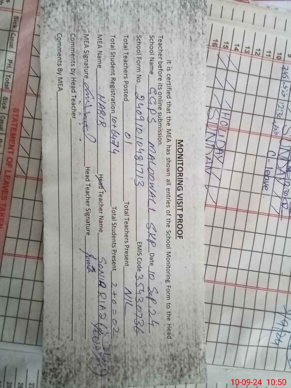 | Attendance Register | Head Teacher | MEA with School | Visit Proof |
