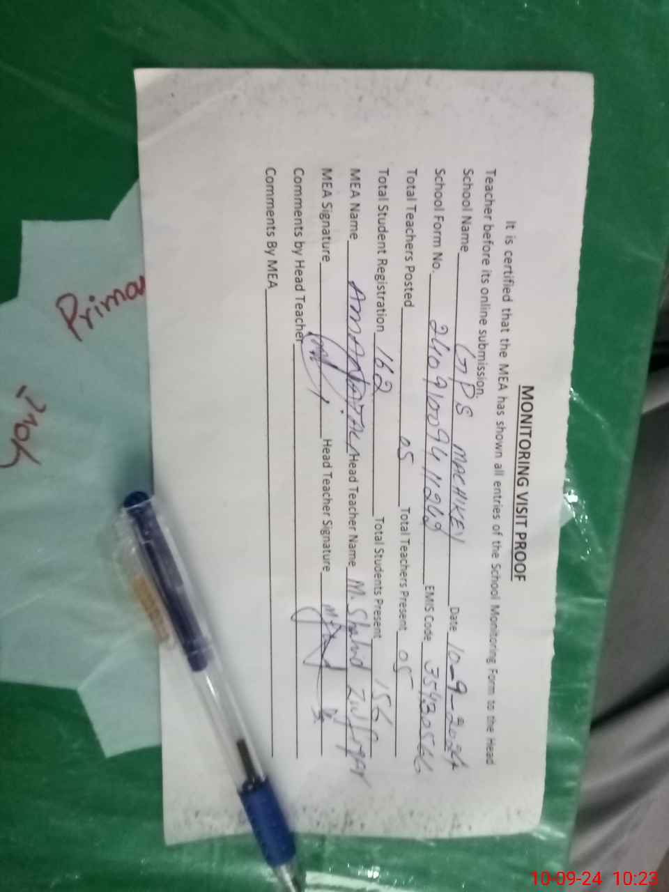 | Attendance Register | Head Teacher | MEA with School | Visit Proof |