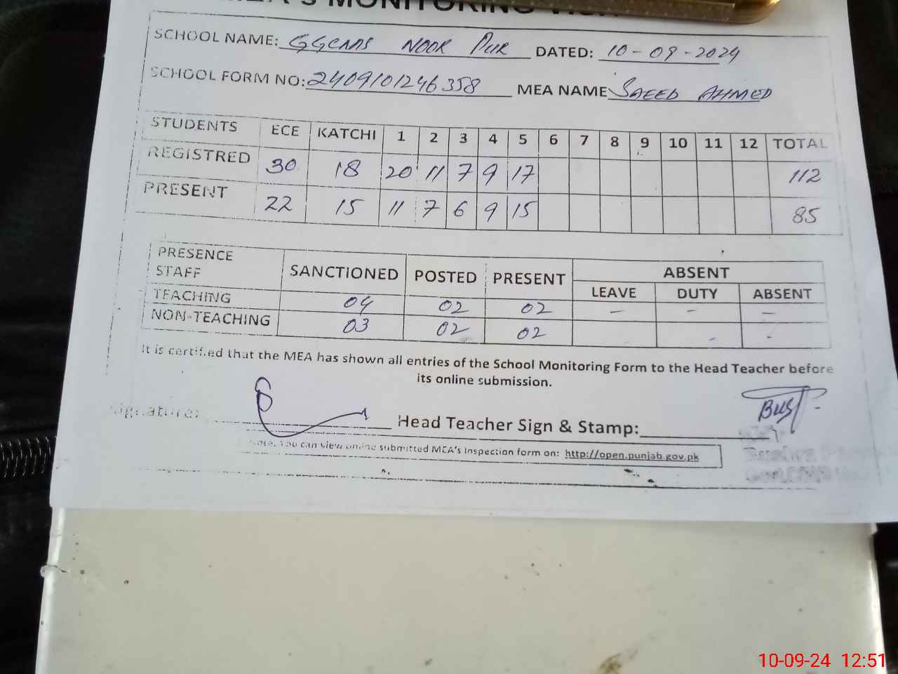 | Attendance Register | Head Teacher | MEA with School | Visit Proof |