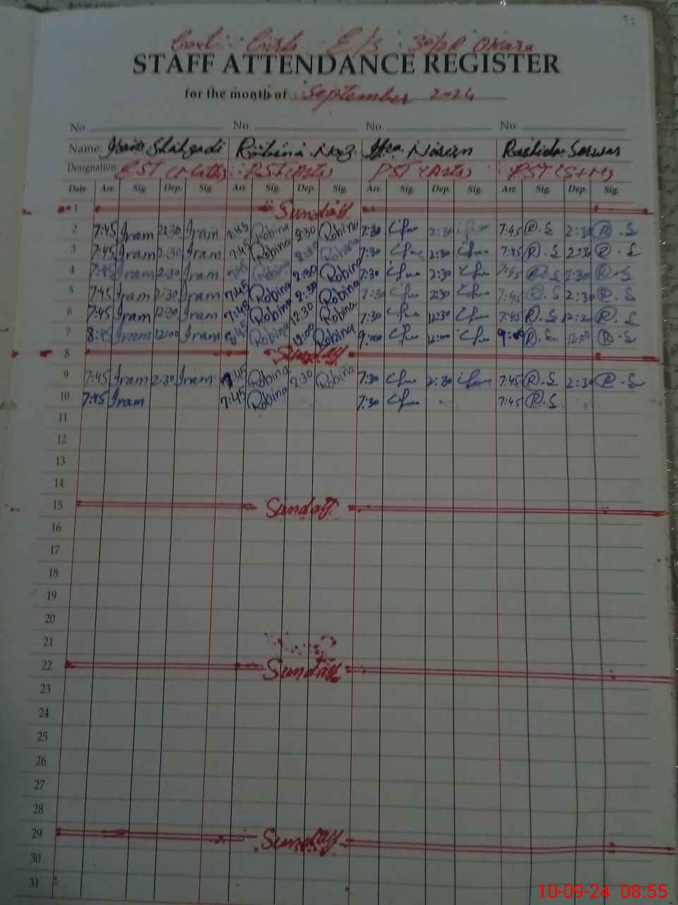 | No. of Students Present - Female | 0 | 0 | 20 | 32 | 28 | 27 | 22 | 21 | 33 | 45 | 42 | 270 | ||||