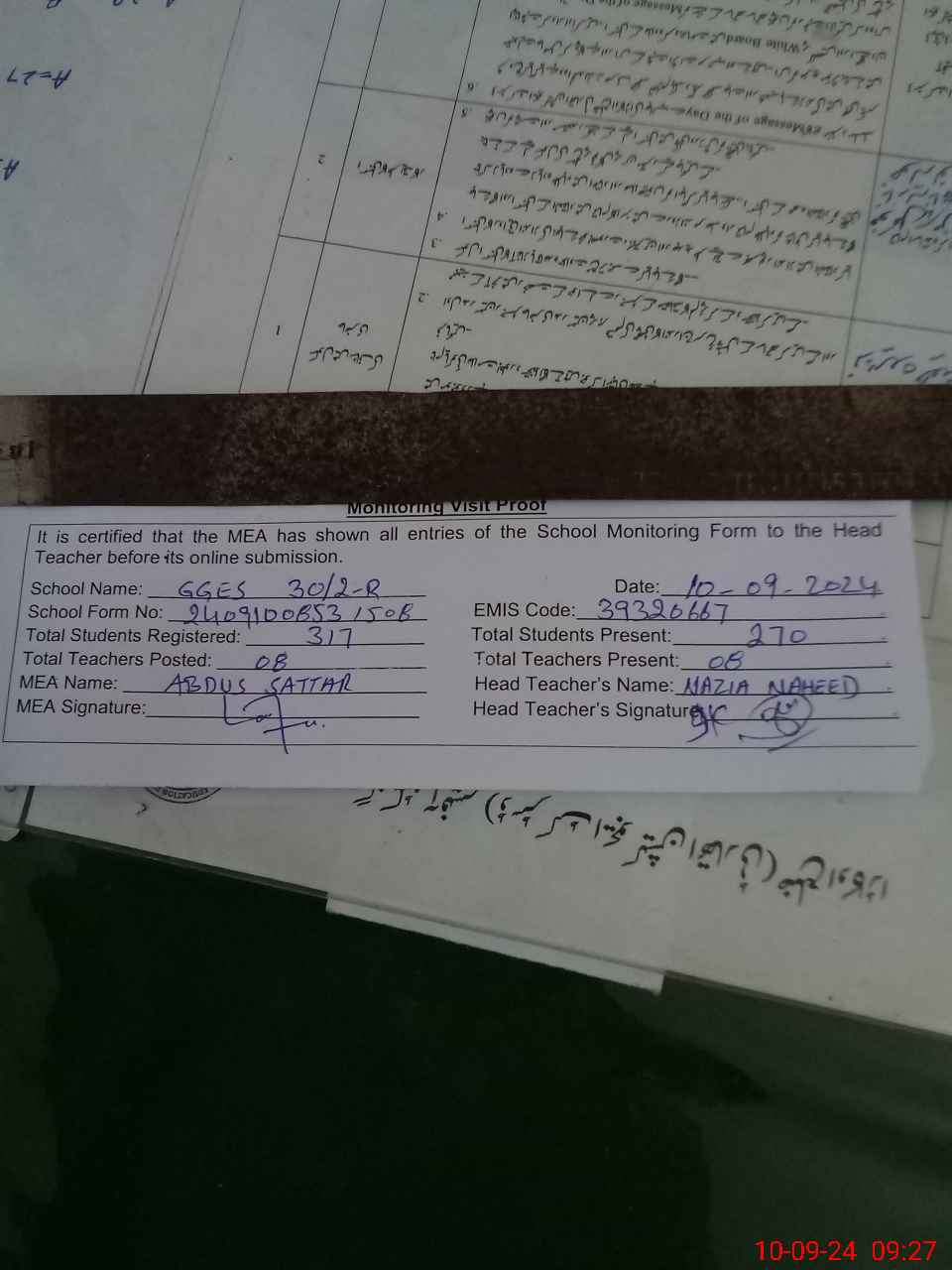 | Attendance Register | Head Teacher | MEA with School | Visit Proof |
