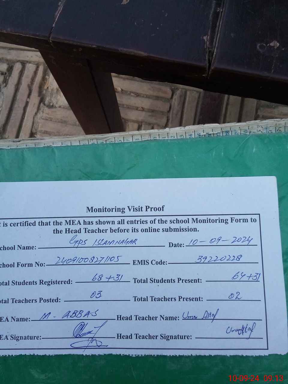 | Attendance Register | Head Teacher | MEA with School | Visit Proof |