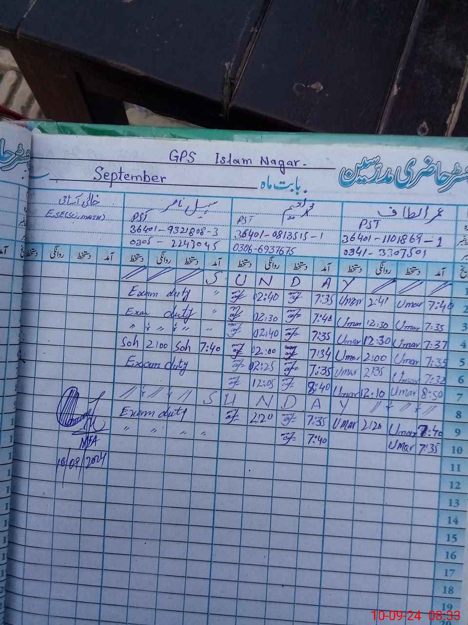 | Name: UM**** AL**** Designation: (School Headmaster's/Headmistress's) PST Phone/Cell Number: 03**** |