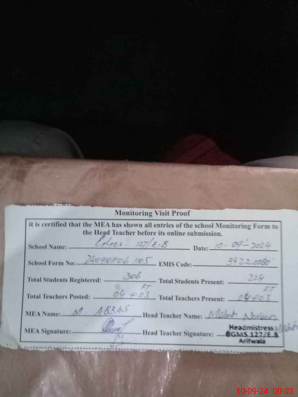 | Attendance Register | Head Teacher | MEA with School | Visit Proof |