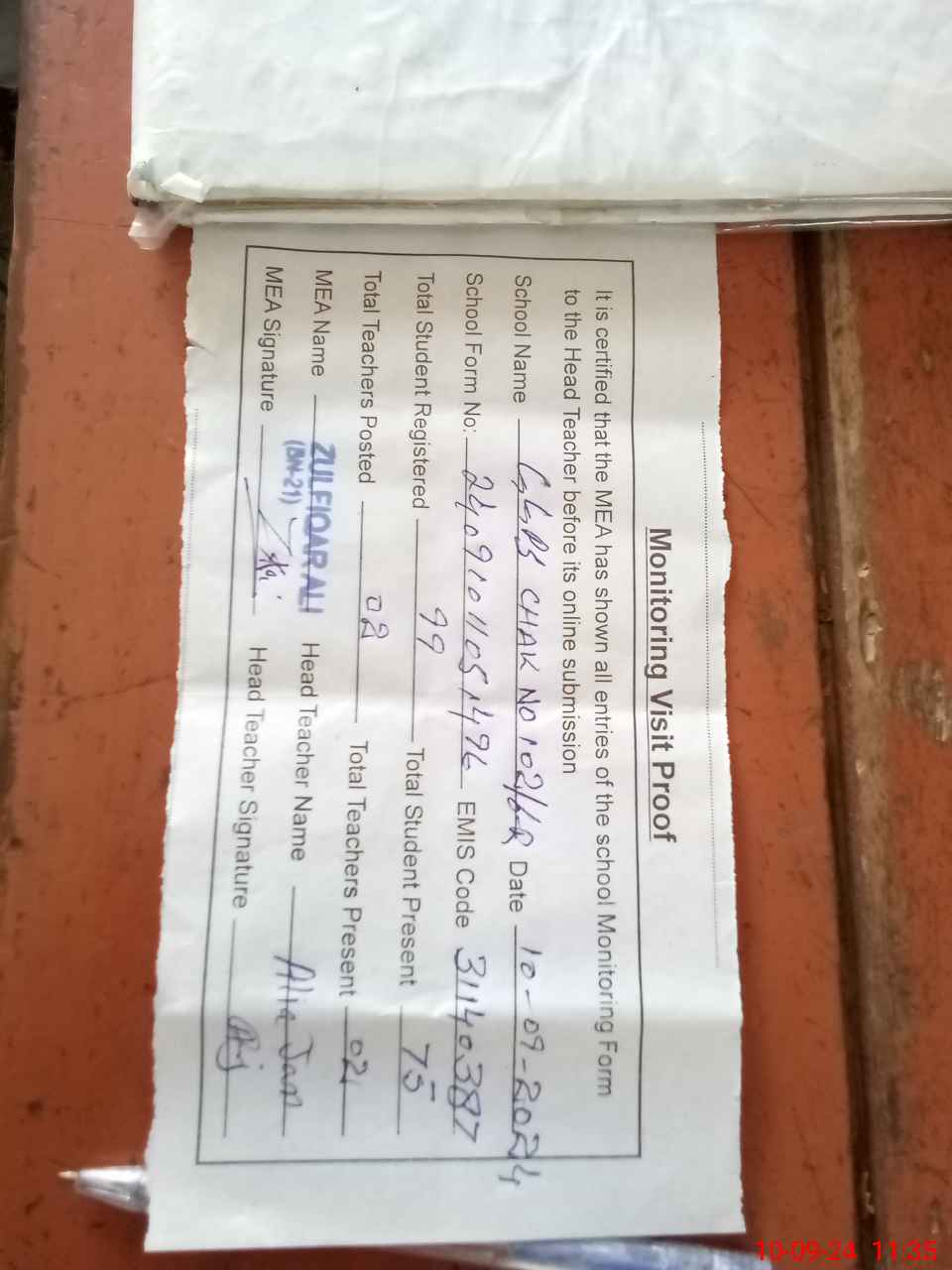 | Attendance Register | Head Teacher | MEA with School | Visit Proof |