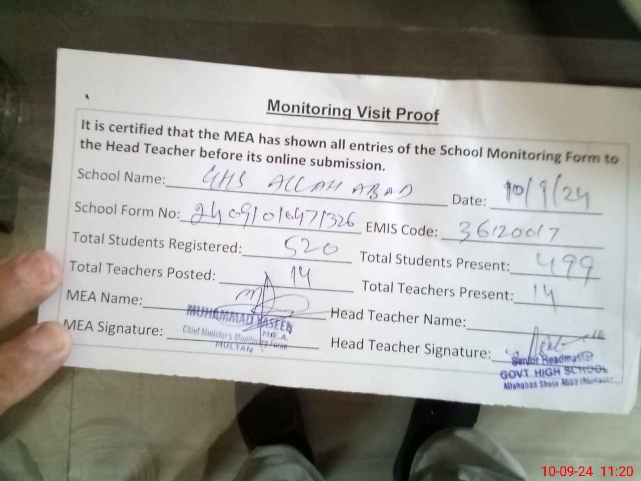 | EMIS Code: 36120017 | Name of School: GHS ALLAH ABAD SHUJABAD | |||