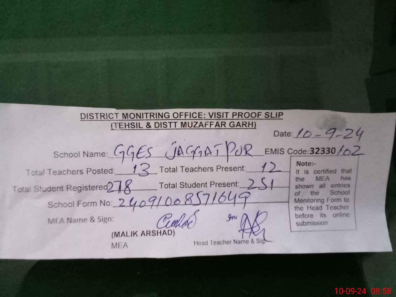 | Attendance Register | Head Teacher | MEA with School | Visit Proof |