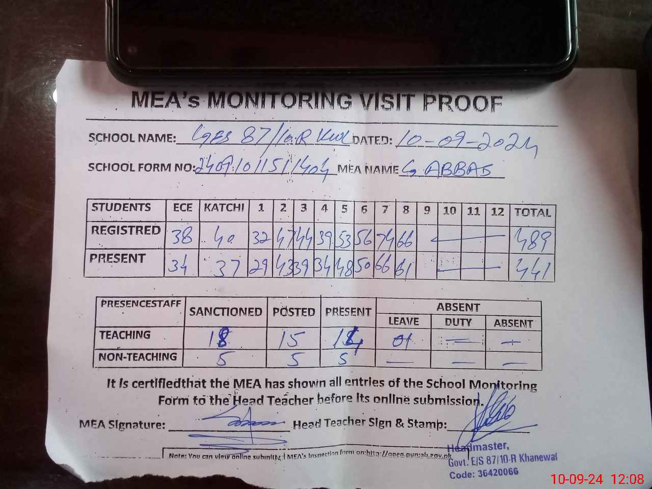 | Attendance Register | Head Teacher | MEA with School | Visit Proof |