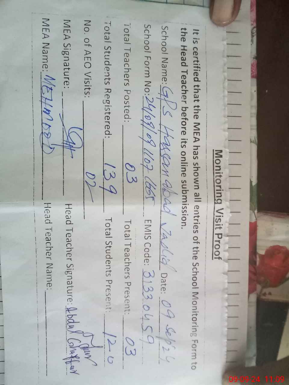 | Attendance Register | Head Teacher | MEA with School | Visit Proof |