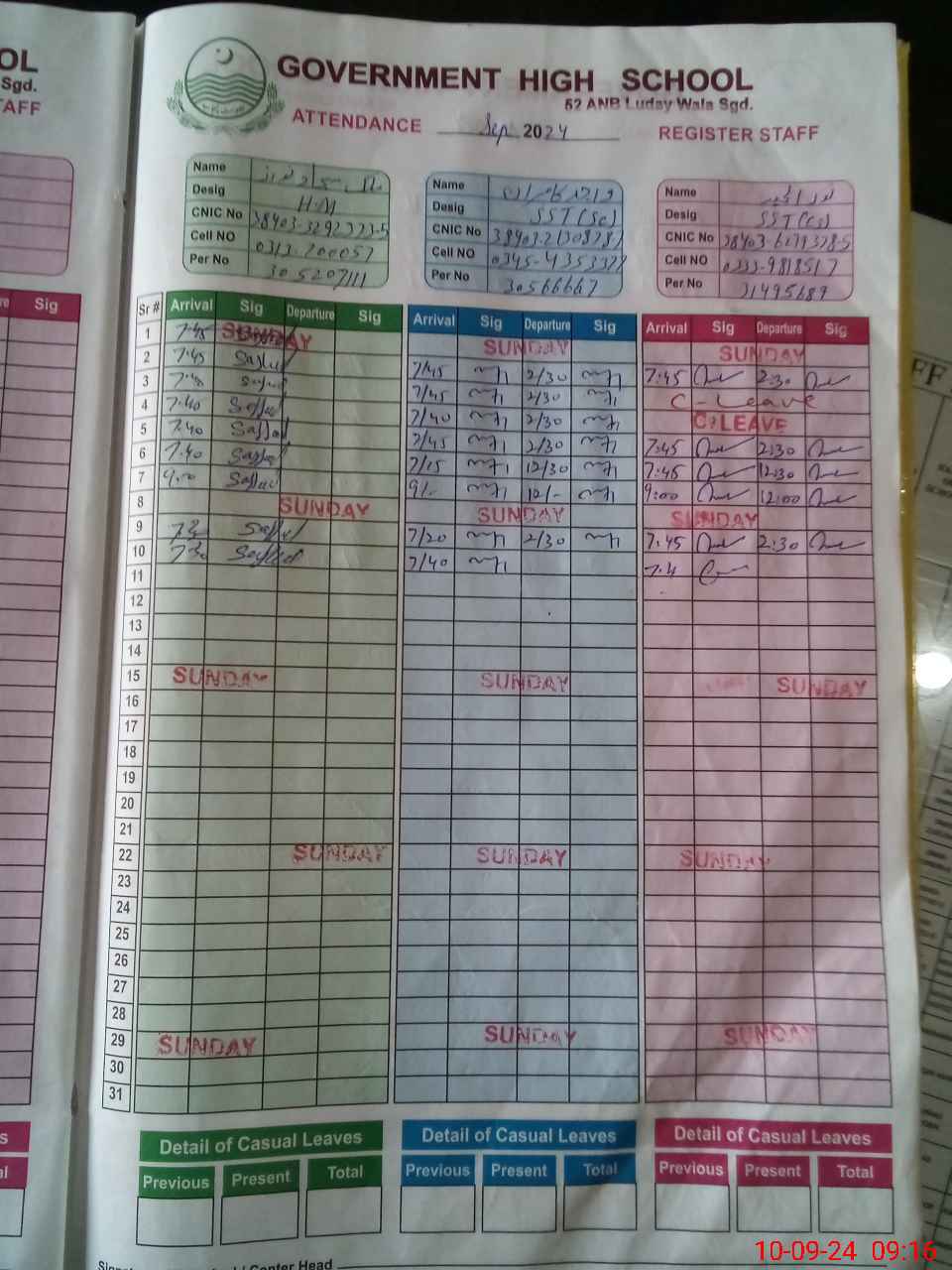 | CNIC | Full Name | Designation | R/C | Absence during last cal. month |