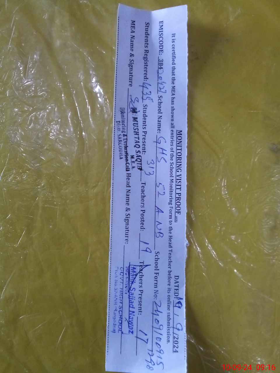 | Monitoring Date: 10-09-2024 | Start Time: 10-09-2024 08:35 AM | End Time: 10-09-2024 09:19 AM | Name of MEA: MU**** MU**** SA**** | |
