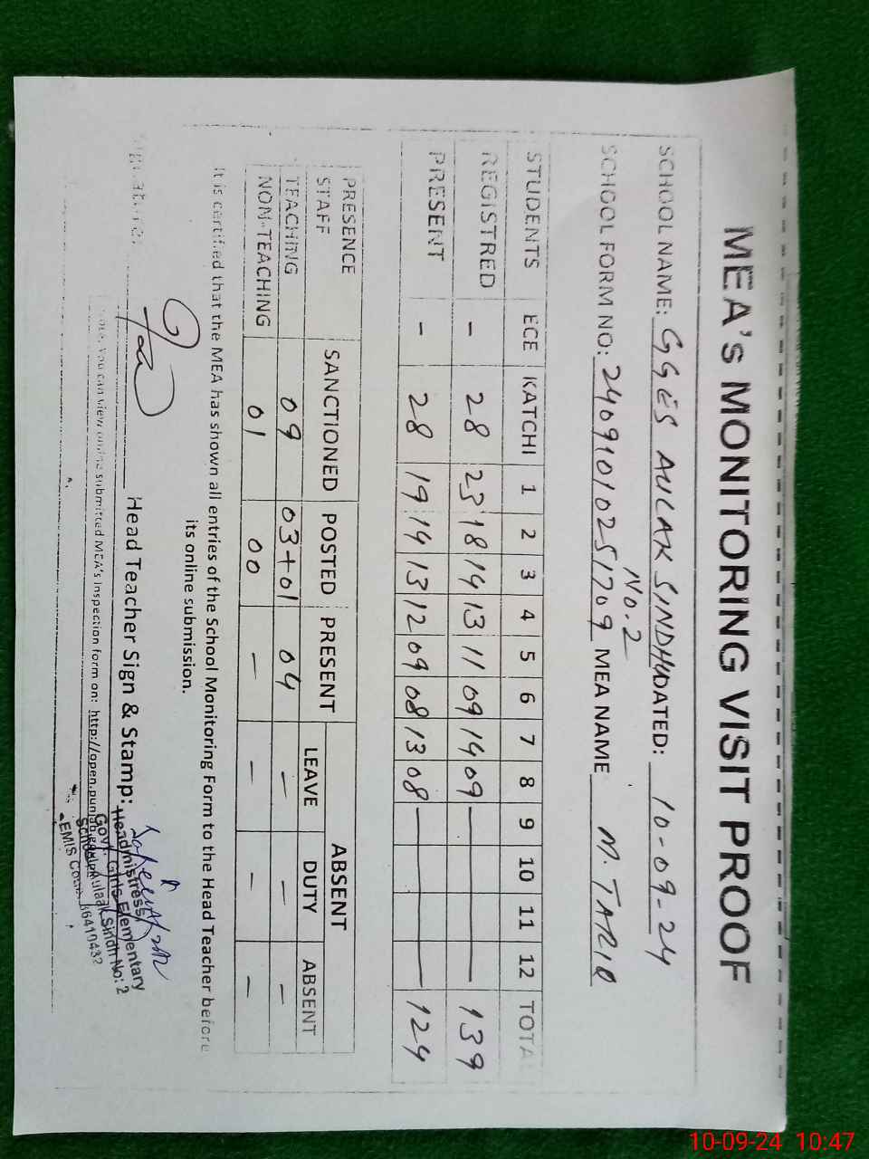 | Attendance Register | Head Teacher | MEA with School | Visit Proof |