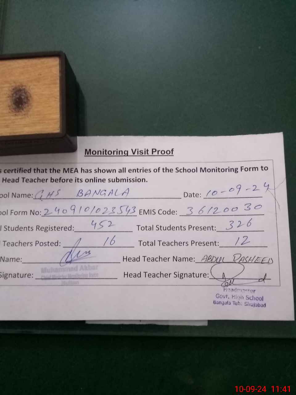 | Certified that this School was Inspected by the Undersigned MEA/DMO Today and the Information Stated Above is as Per Record. | |||||