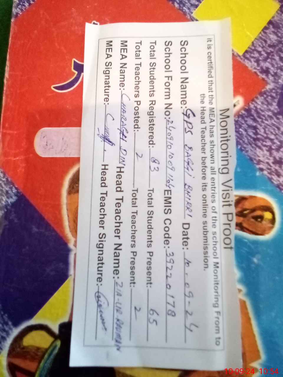 | Attendance Register | Head Teacher | MEA with School | Visit Proof |