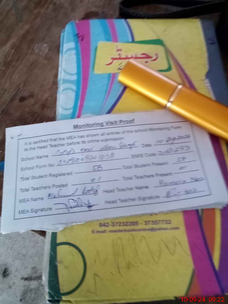 | Attendance Register | Head Teacher | MEA with School | Visit Proof |