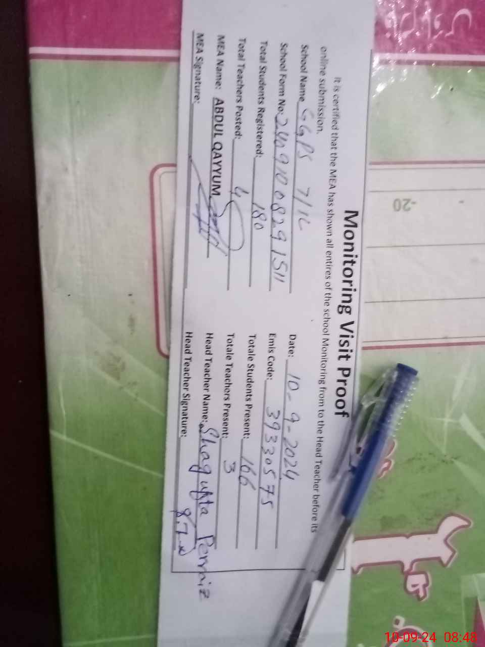 | Attendance Register | Head Teacher | MEA with School | Visit Proof |