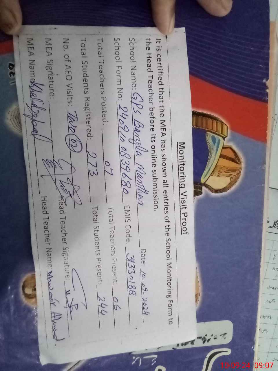 | Attendance Register | Head Teacher | MEA with School | Visit Proof |