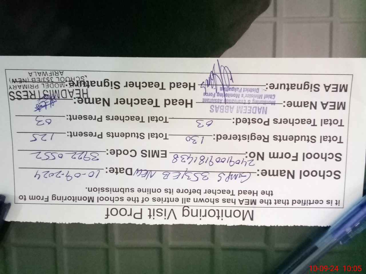 | Certified that this School was Inspected by the Undersigned MEA/DMO Today and the Information Stated Above is as Per Record. | |||||