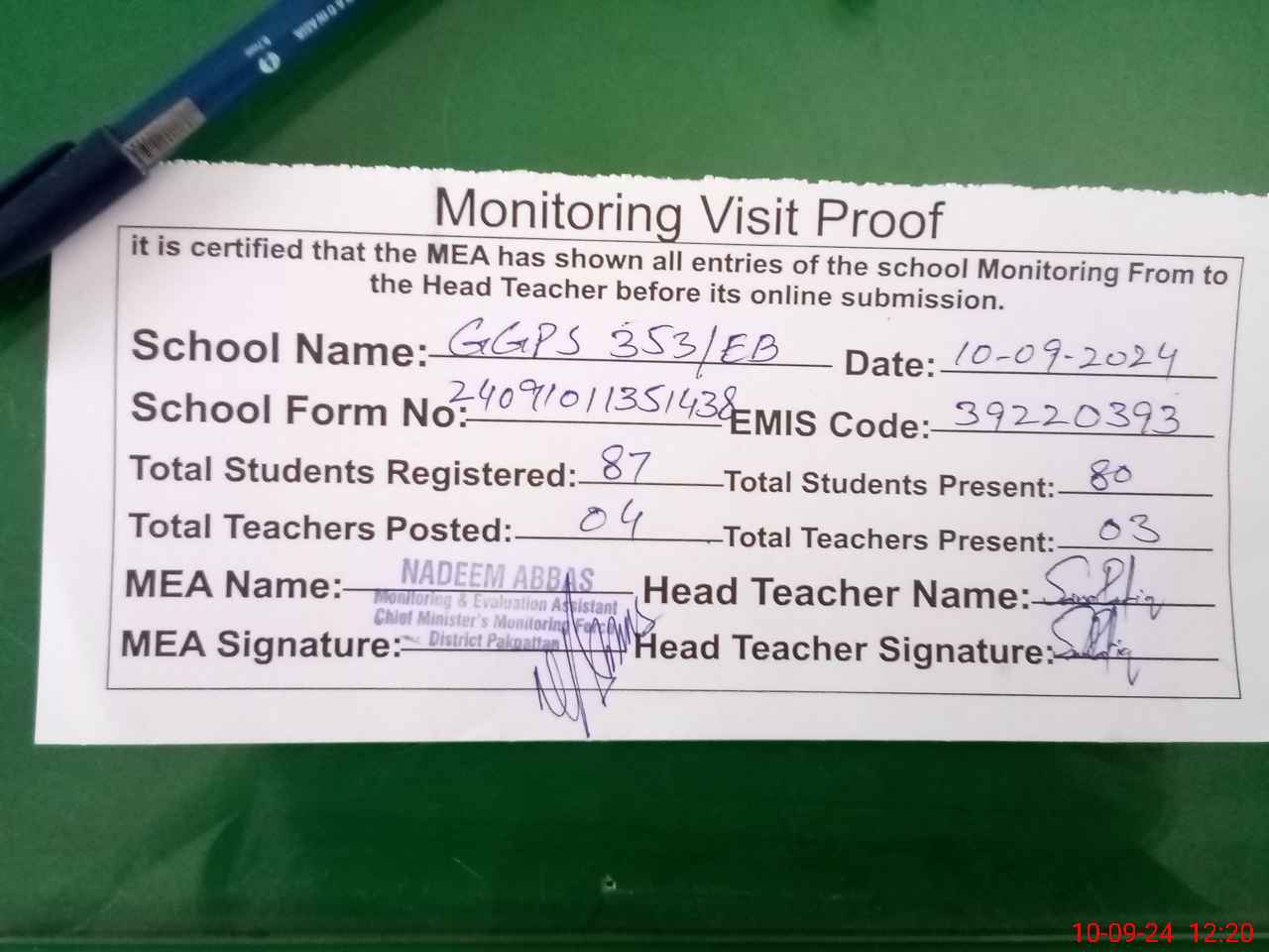 | Attendance Register | Head Teacher | MEA with School | Visit Proof |