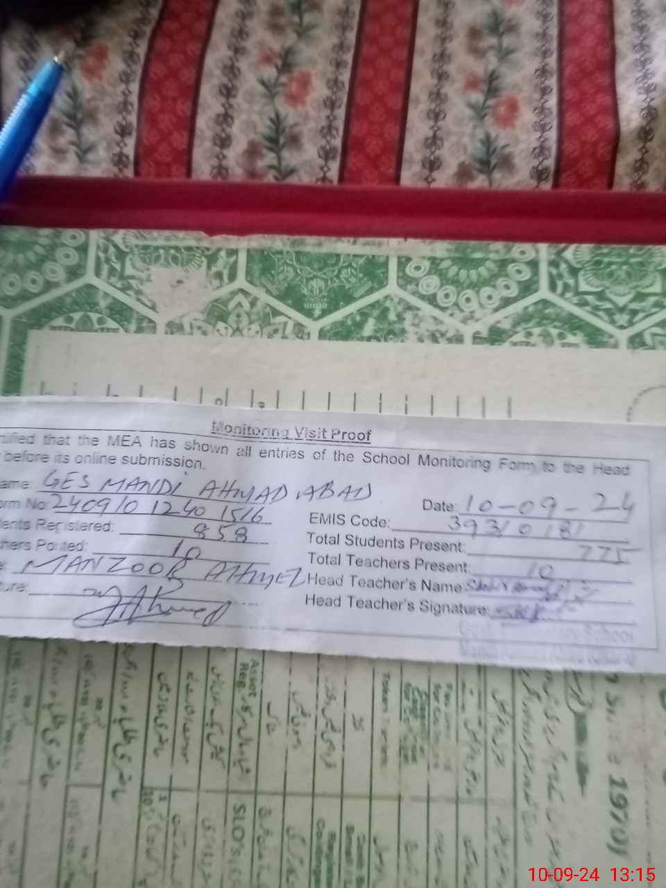 | Certified that this School was Inspected by the Undersigned MEA/DMO Today and the Information Stated Above is as Per Record. | |||||