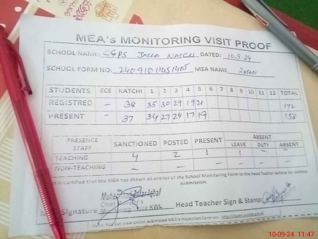 | Attendance Register | Head Teacher | MEA with School | Visit Proof |