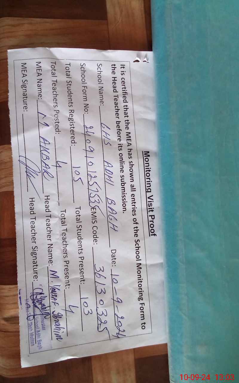 | EMIS Code: 36130325 | Name of School: GPS ADHI BAGH MOZA TARAGARH P/O KHOKHAR | |||