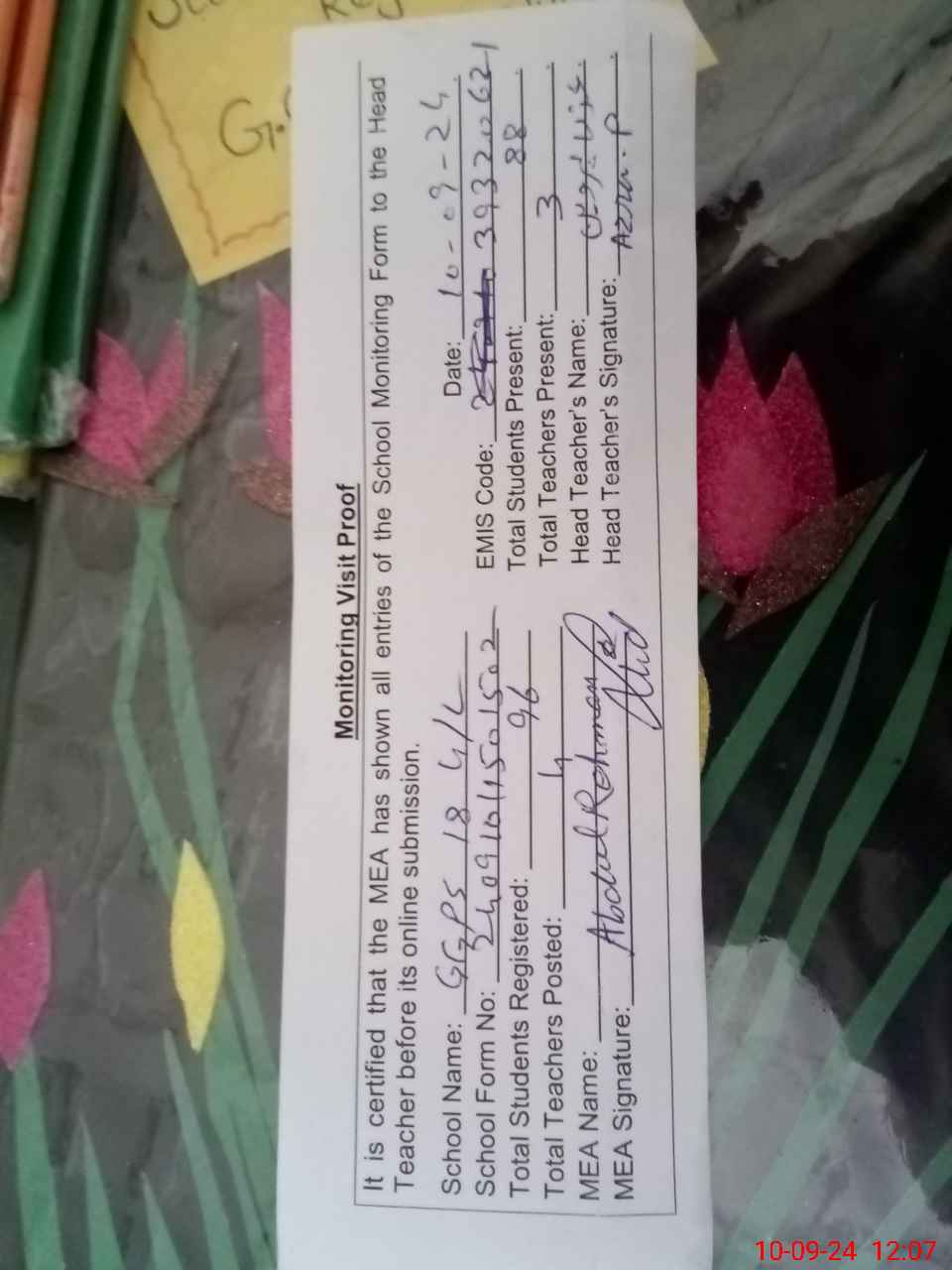 | Attendance Register | Head Teacher | MEA with School | Visit Proof |