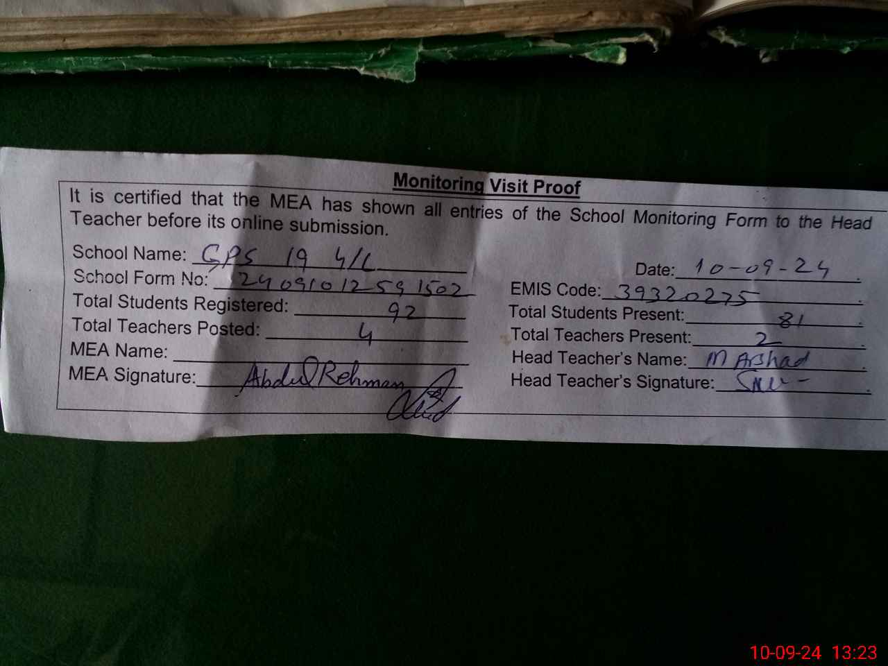 | Attendance Register | Head Teacher | MEA with School | Visit Proof |
