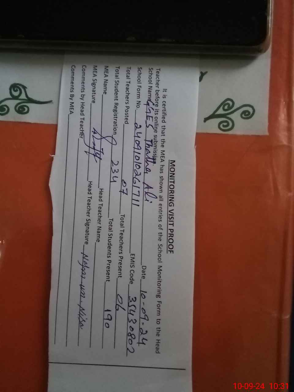 | Attendance Register | Head Teacher | MEA with School | Visit Proof |