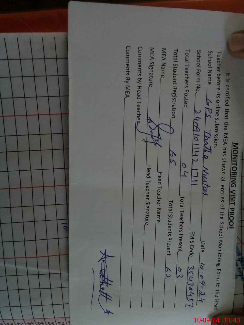 | Attendance Register | Head Teacher | MEA with School | Visit Proof |
