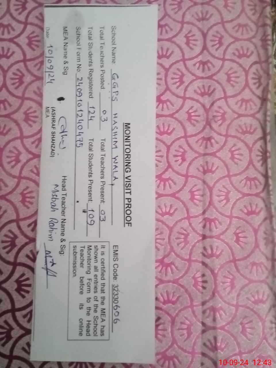 | EMIS Code: 32330606 | Name of School: GGPS HASHIM WALA | |||