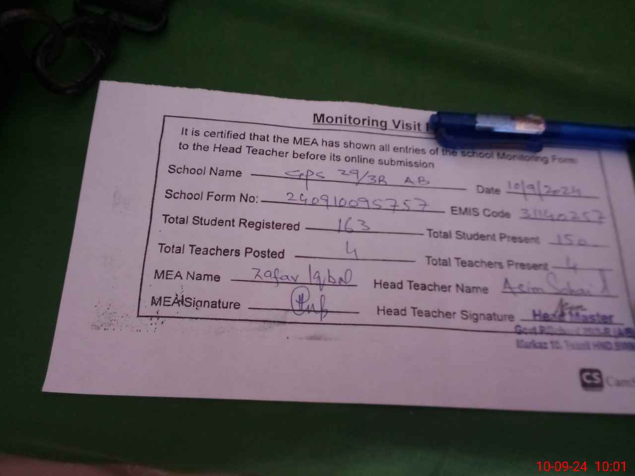 | Monitoring Date: 10-09-2024 | Start Time: 10-09-2024 09:45 AM | End Time: 10-09-2024 10:01 AM | Name of MEA: Za**** Iq**** BN**** | |