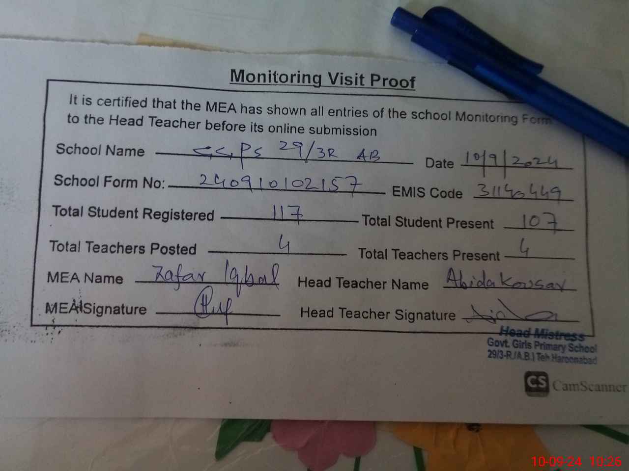 | Attendance Register | Head Teacher | MEA with School | Visit Proof |