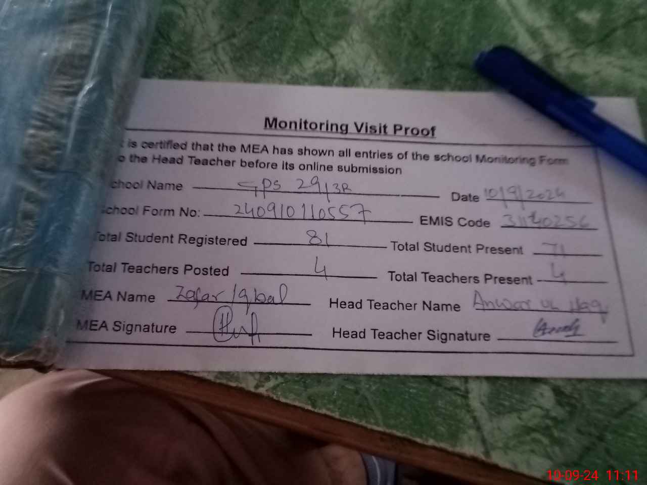 | Monitoring Date: 10-09-2024 | Start Time: 10-09-2024 10:55 AM | End Time: 10-09-2024 11:11 AM | Name of MEA: Za**** Iq**** BN**** | |