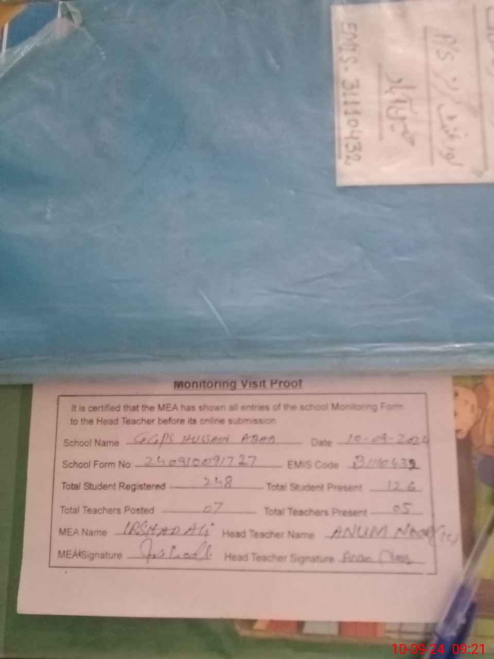 | Attendance Register | Head Teacher | MEA with School | Visit Proof |