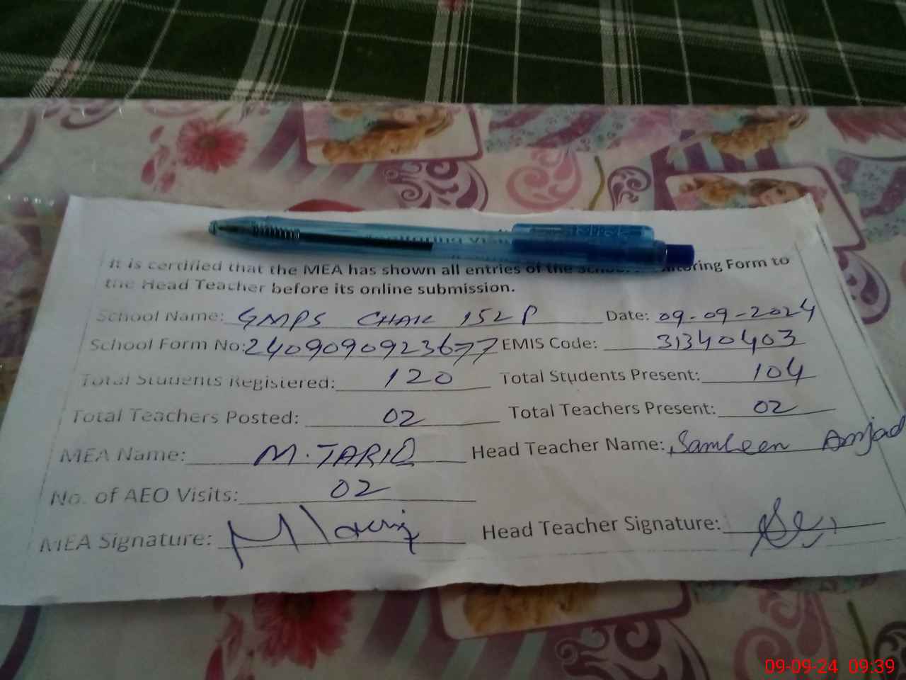 | Attendance Register | Head Teacher | MEA with School | Visit Proof |