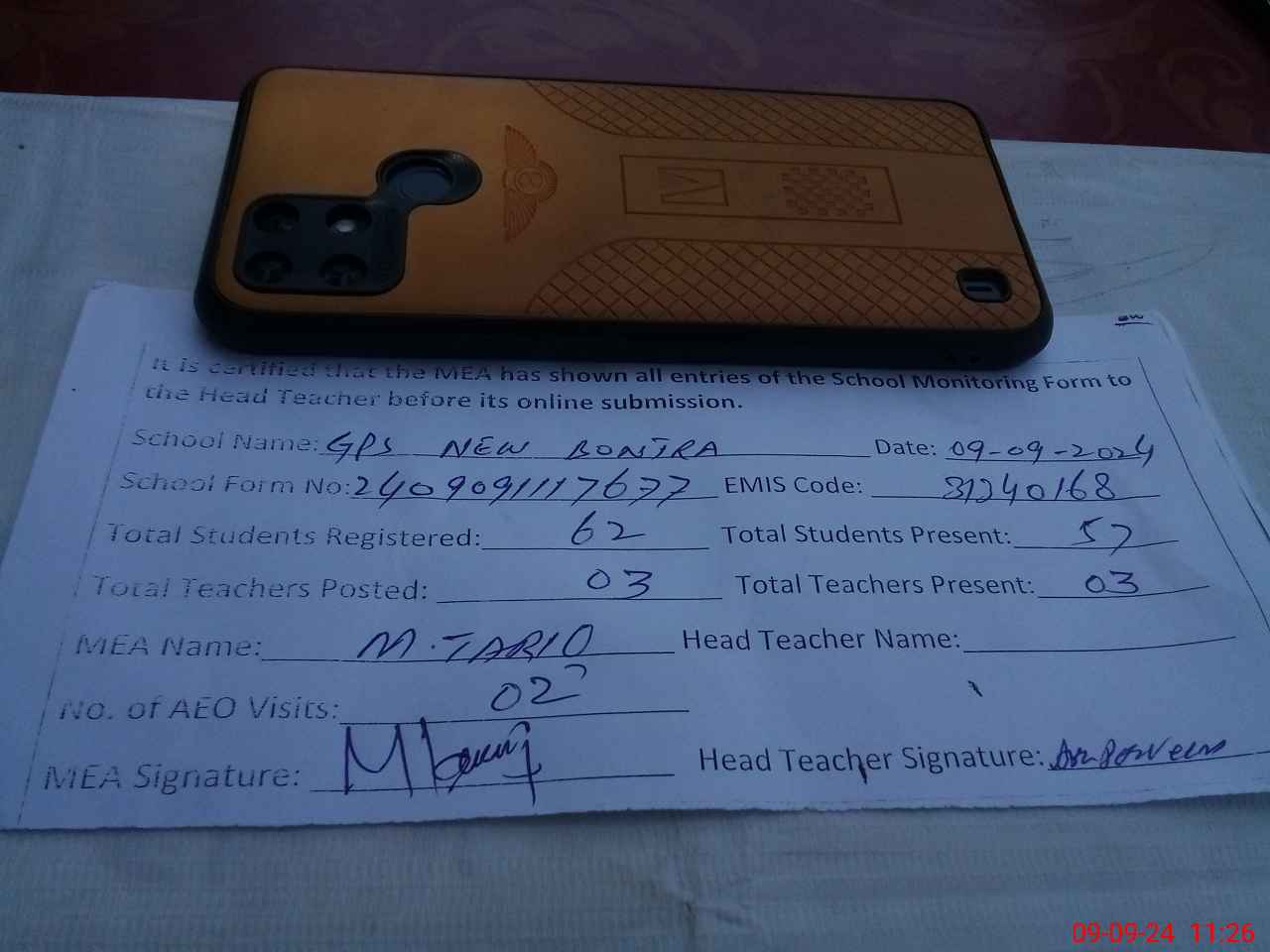 | Attendance Register | Head Teacher | MEA with School | Visit Proof |