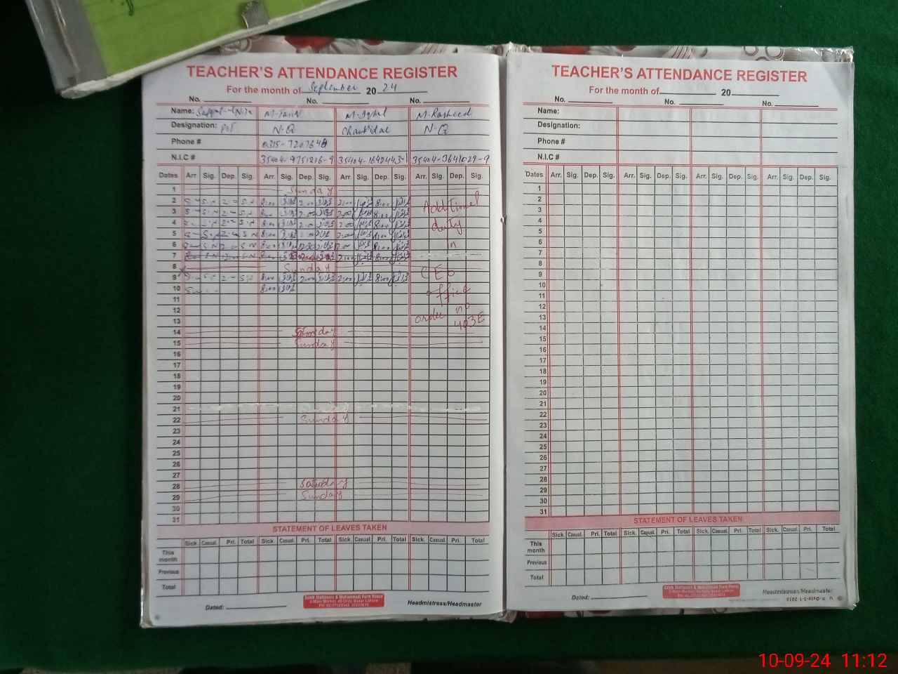 | CNIC | Full Name | Designation | R/C | Absence During Last Calender Month |