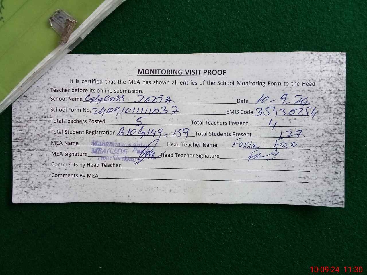 | Attendance Register | Head Teacher | MEA with School | Visit Proof |
