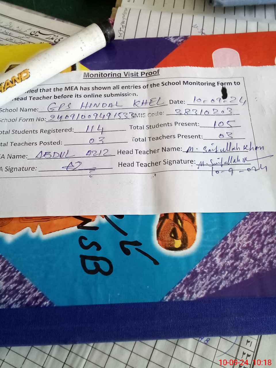 | Attendance Register | Head Teacher | MEA with School | Visit Proof |