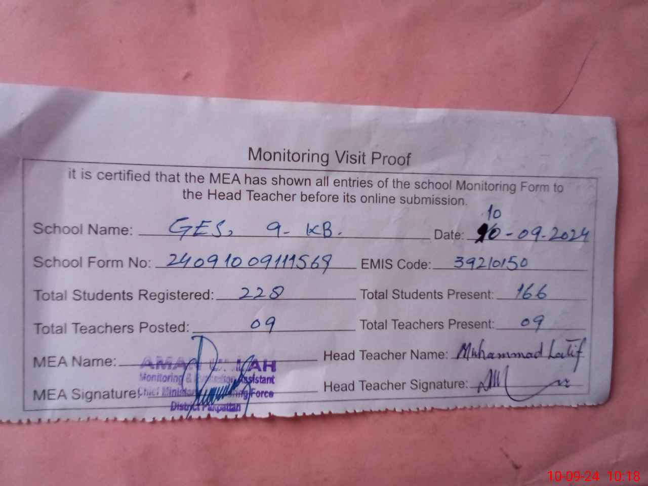 | Attendance Register | Head Teacher | MEA with School | Visit Proof |