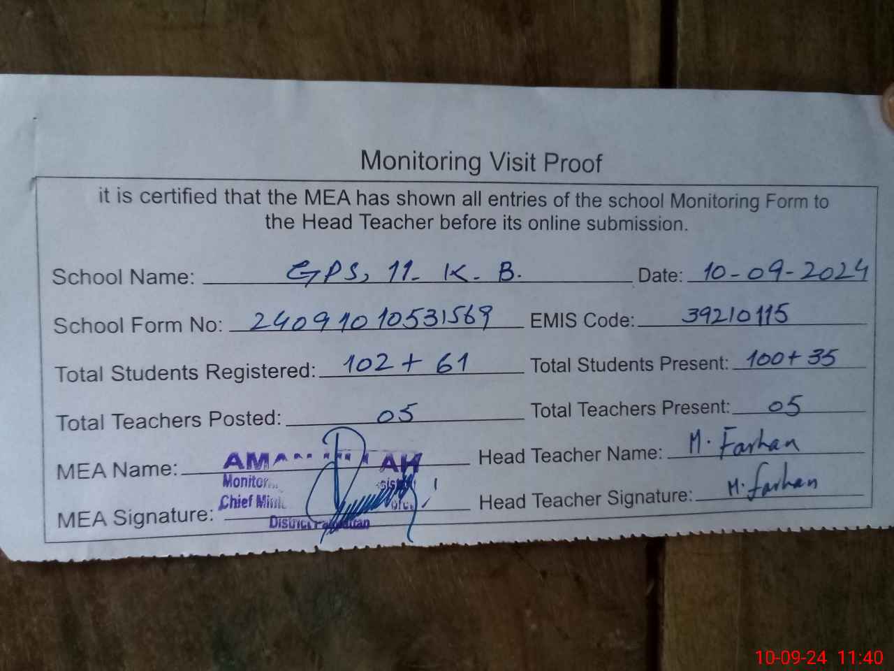 | Attendance Register | Head Teacher | MEA with School | Visit Proof |