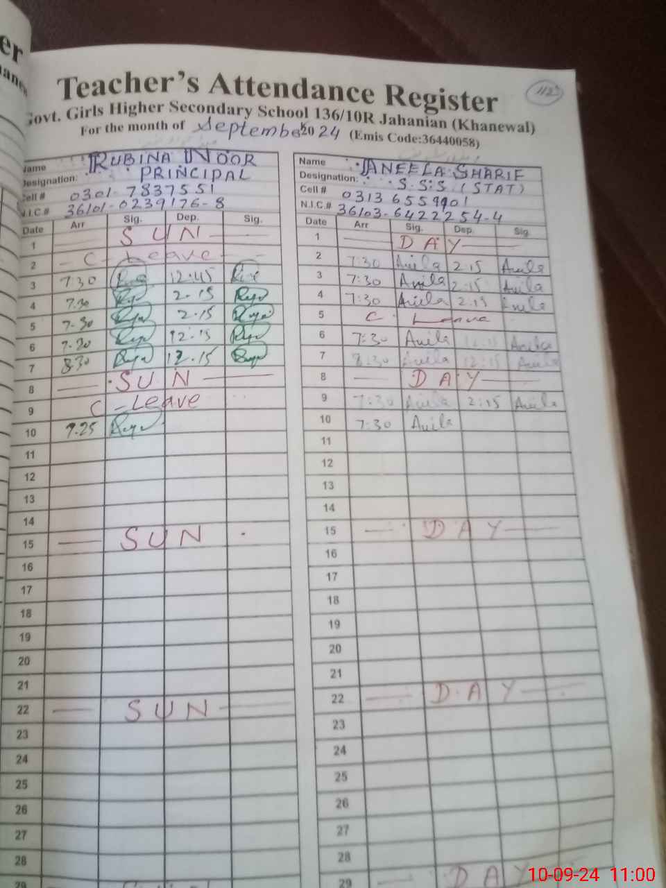 | CNIC | Full Name | Designation | R/C | Absence during last cal. month |