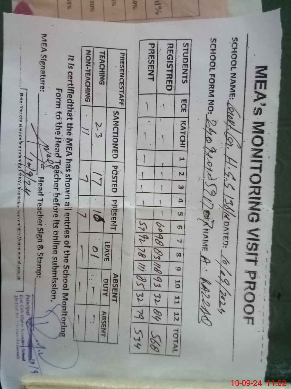 | Attendance Register | Head Teacher | MEA with School | Visit Proof |