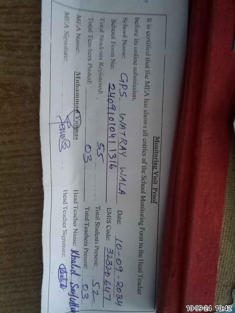 | EMIS Code: 32320647 | Name of School: GPS WATRAY WALA | |||