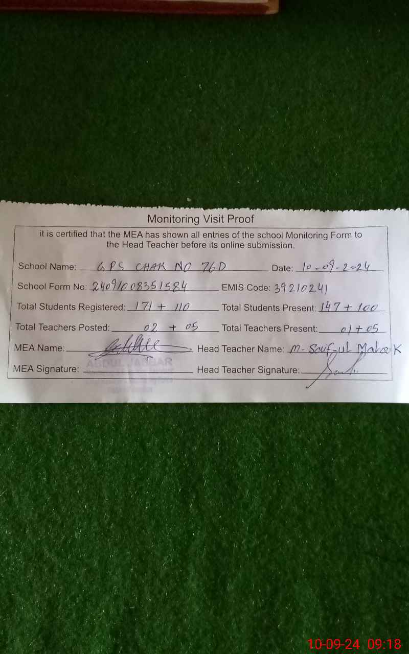 | EMIS Code: 39210241 | Name of School: GPS CHAK NO. 76/D | |||