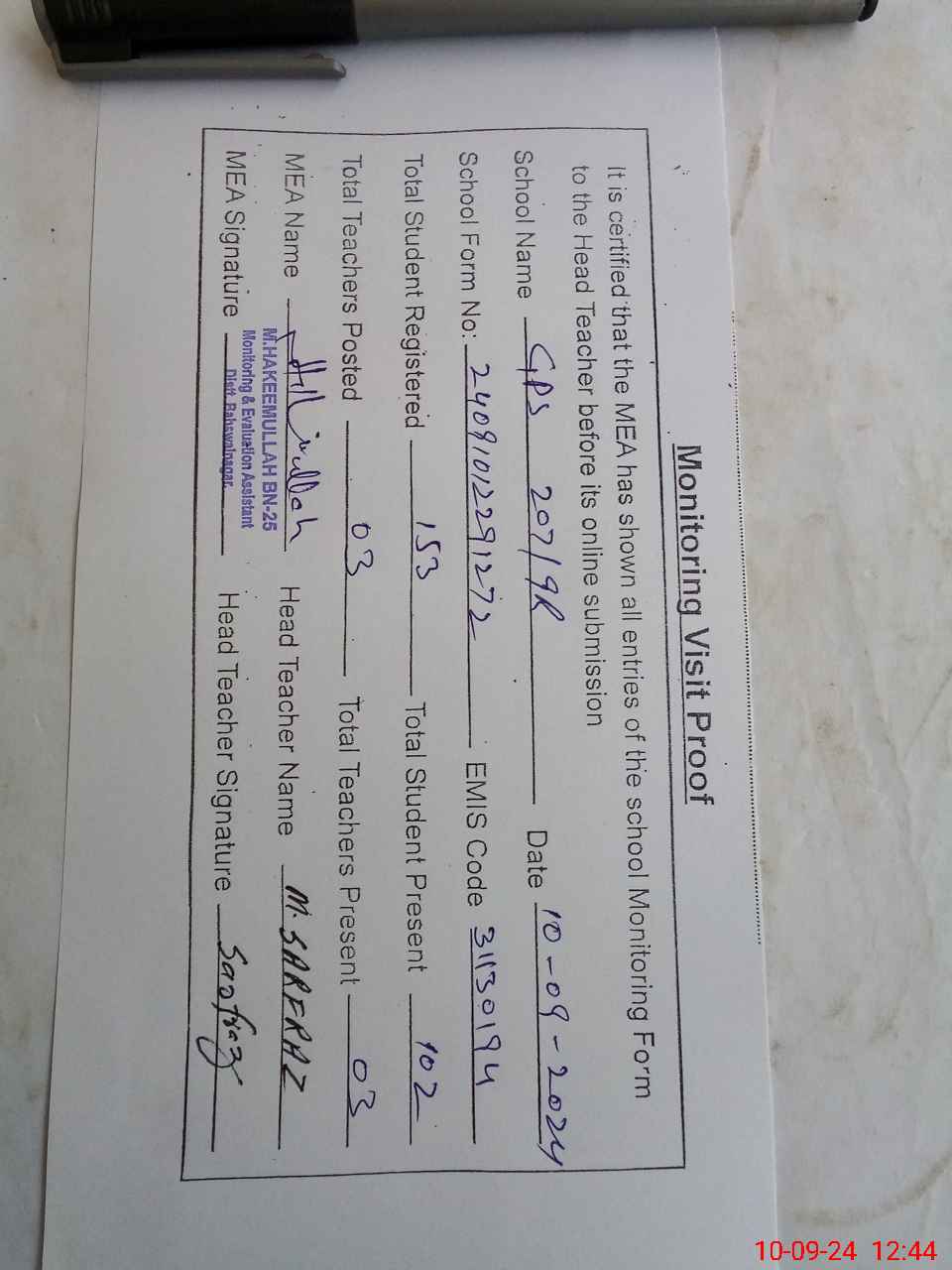 | EMIS Code: 31130194 | Name of School: GPS CHAK 207/9-R | |||